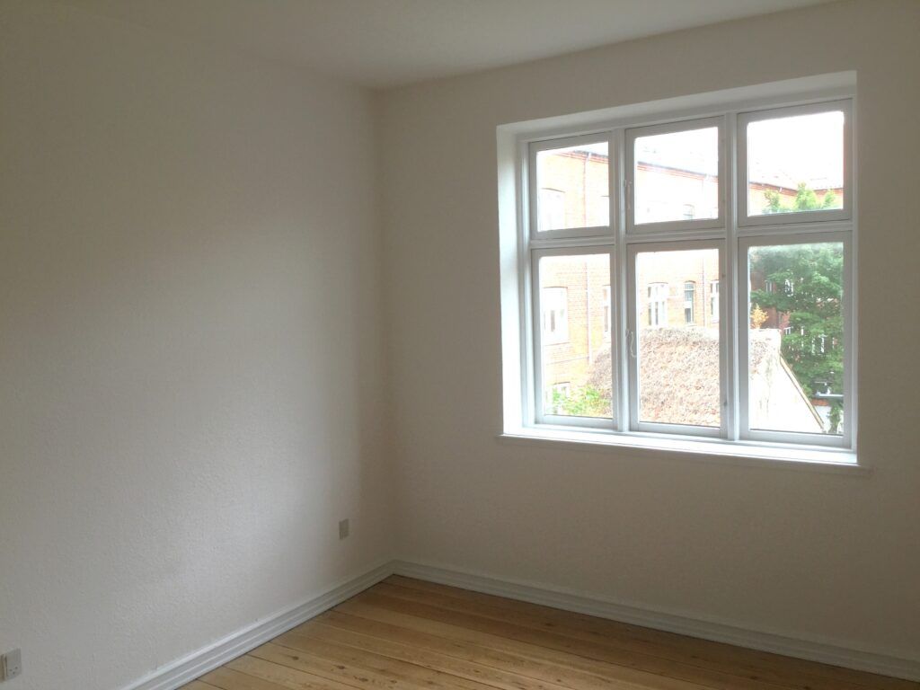 Stuen har en god størrelse med flot lysindfald, pænt trægulv og dekorativ stuk langs loftskanten, som tilfører rummet klassisk charme. Værelset er ligeledes rummeligt med stort vinduesparti og pænt trægulv.