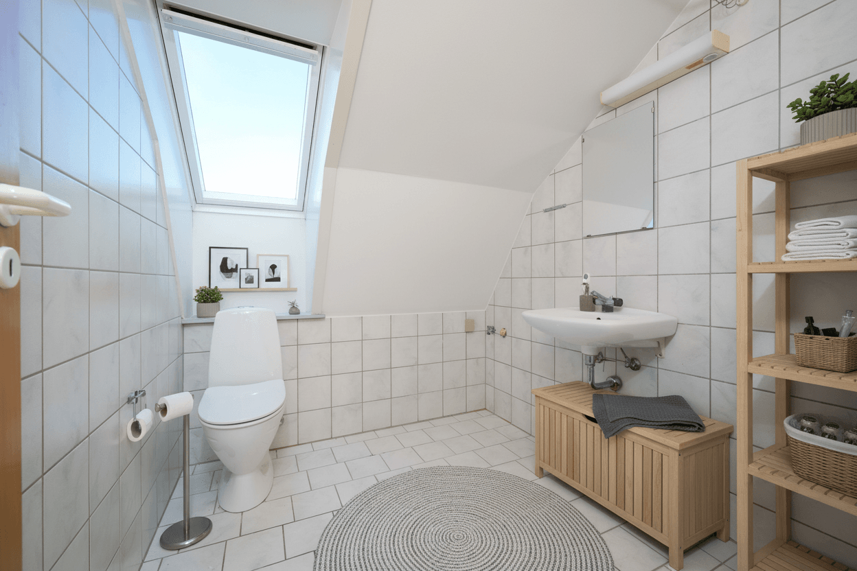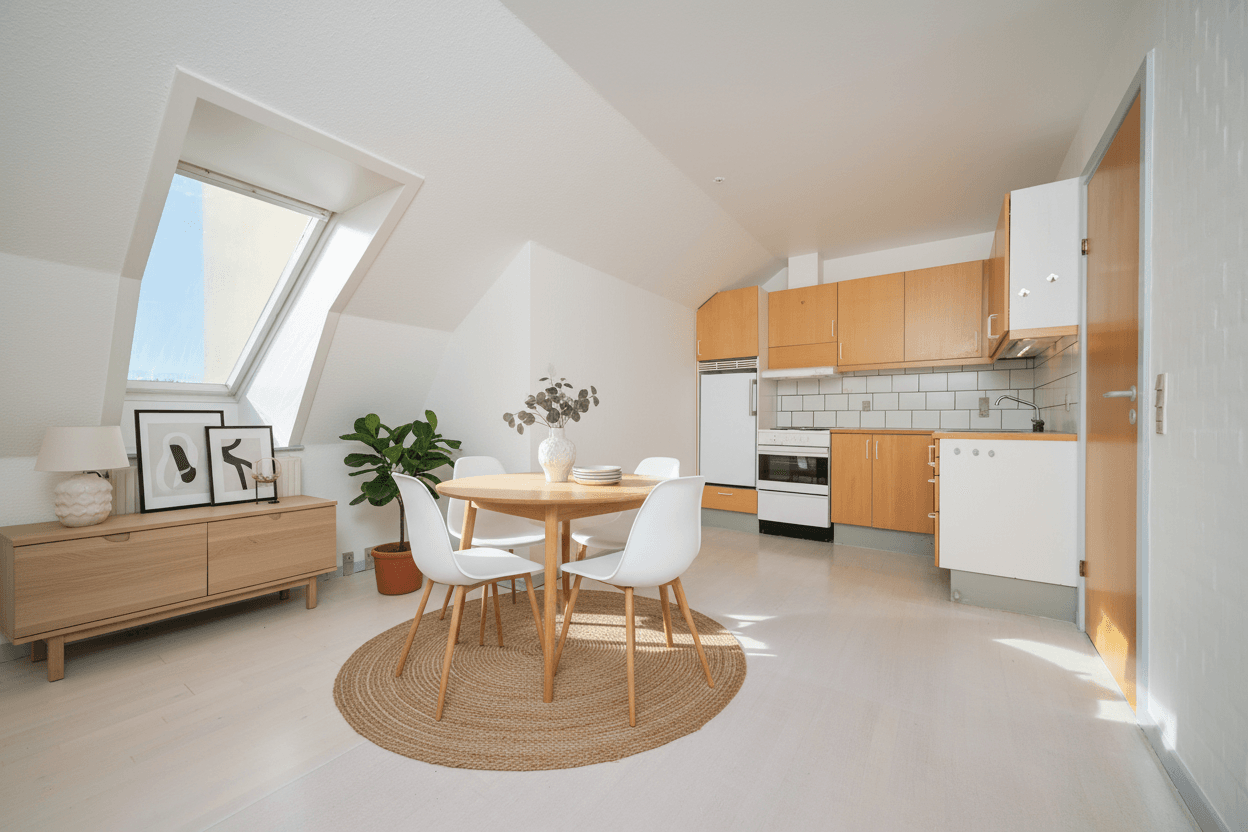 Køkkenet er veludstyret med god bordplads, komfur, køleskab og emhætte, så madlavningen bliver en fornøjelse. Lejligheden overtages nymalet og klar til indflytning.