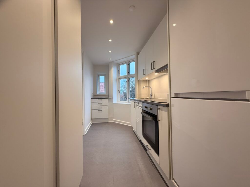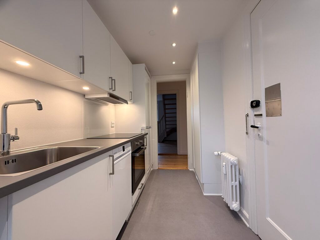 Lejlighedens nederste plan byder på et helt nyt køkken med alle hårde hvidevarer og indbyggede spots i loftet. Herudover findes et gæstetoilet samt en rummelig stue med trappe til øverste etage. Fra værelset på nederste plan er der direkte udgang til en hyggelig altan – perfekt til morgenkaffen. Både stue og værelse har flotte trægulve.