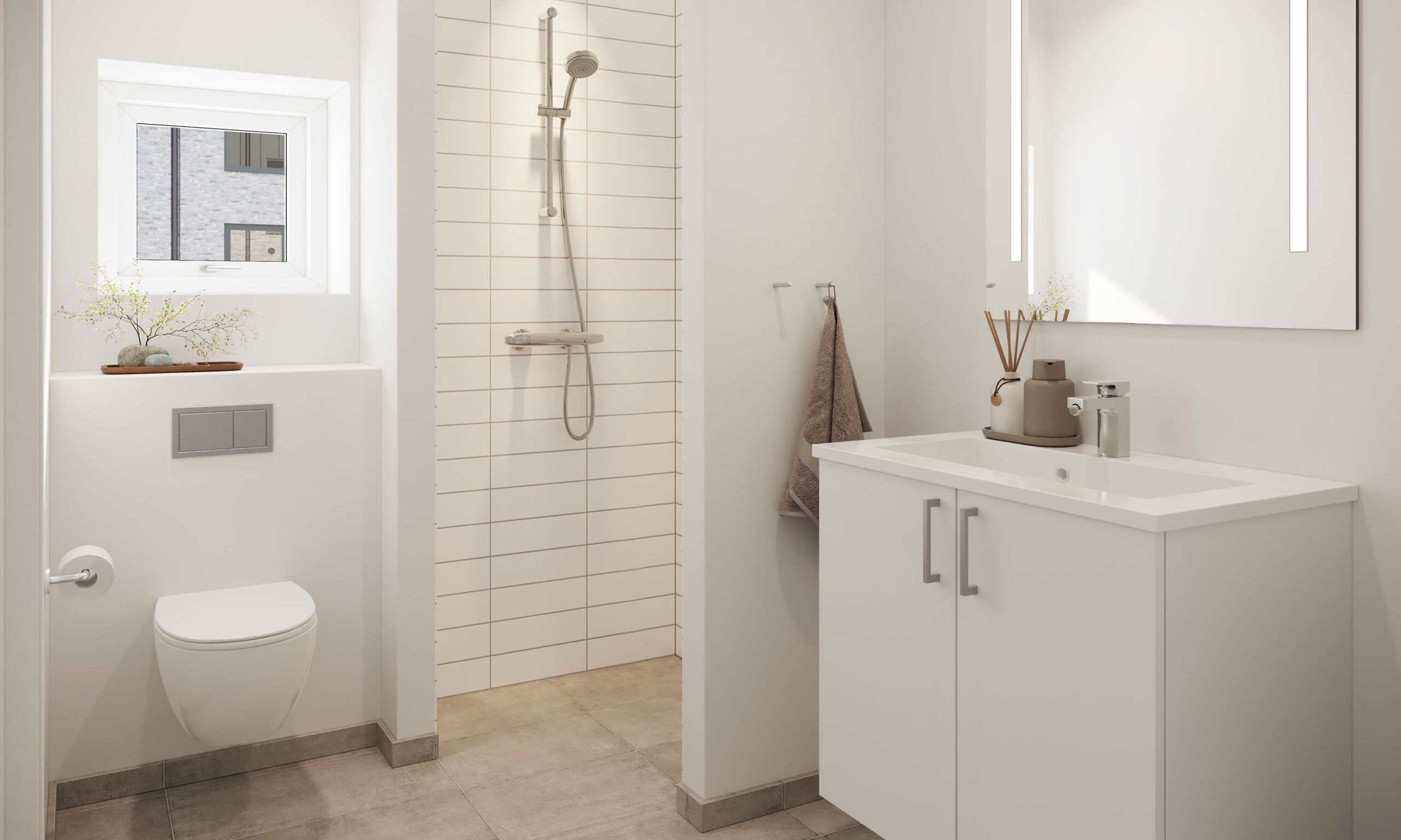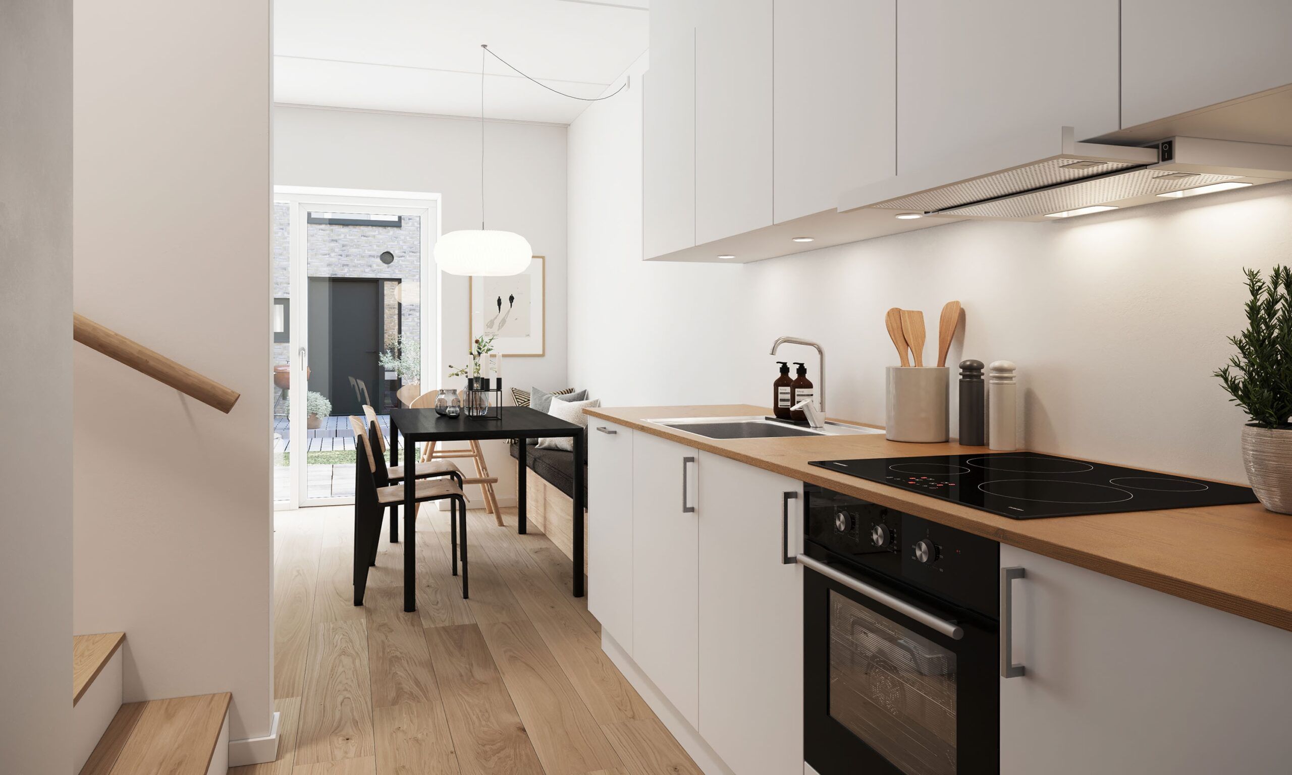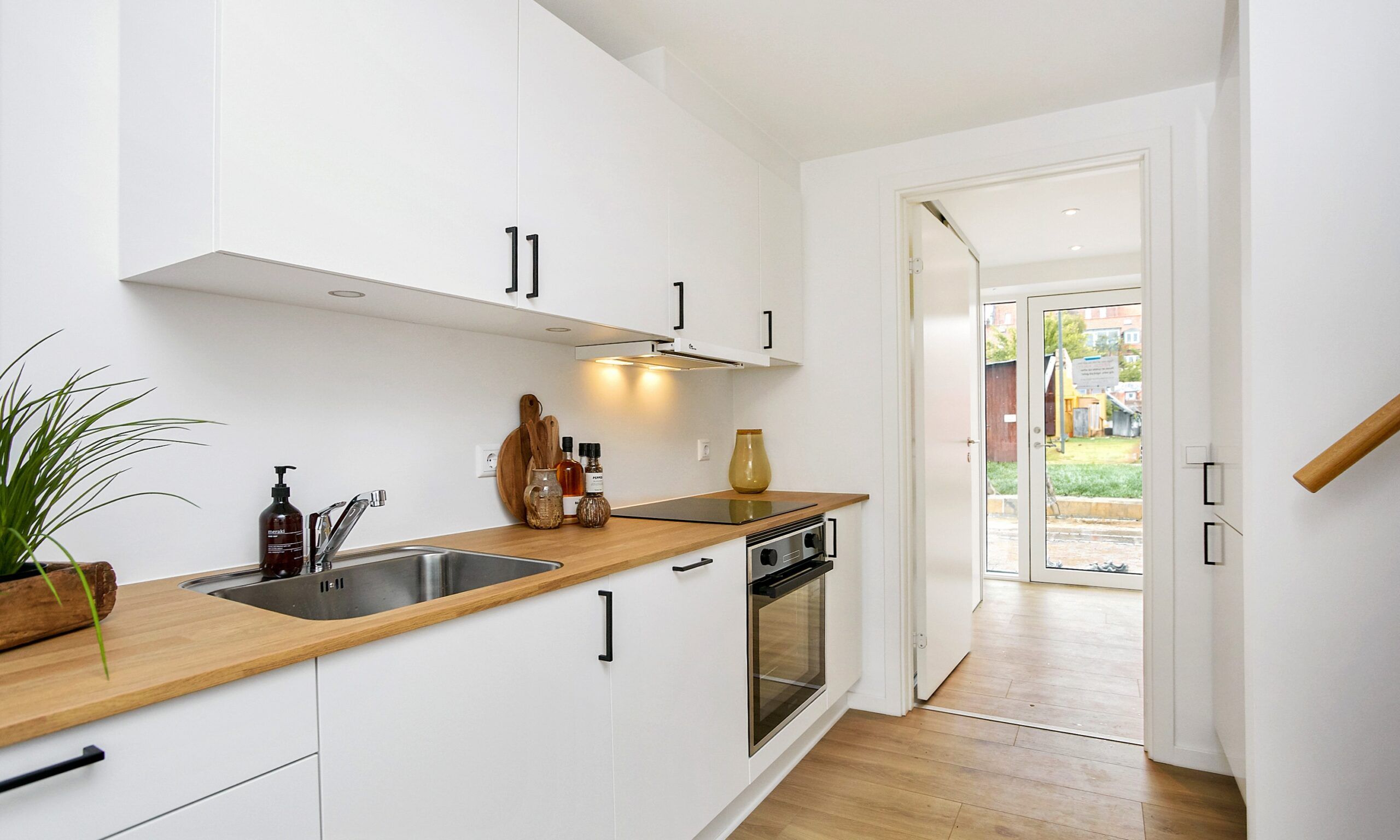 I køkkenet finder du bordplader med et elegant udseende i træ, som tilfører en naturlig varme og karakter til rummet. Denne fine detalje suppleres af hårde hvidevarer fra Scandomestic, kendt for deres kvalitet og holdbarhed. De moderne apparater er allerede installeret og klar til brug, hvilket sikrer en problemfri overgang til dit nye hjem.