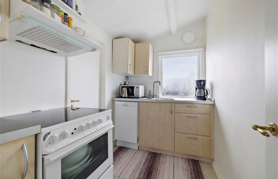 På trods af de knap 50 kvm, så er der en god planløsning med 2 soveværelser, en vinkelstue og toilet/bad. Køkkenet er praktisk indrettet med alt nødvendigt udstyr som ovn, mikroovn, opvaskemaskine mm, og der medfølger også vaskemaskine.