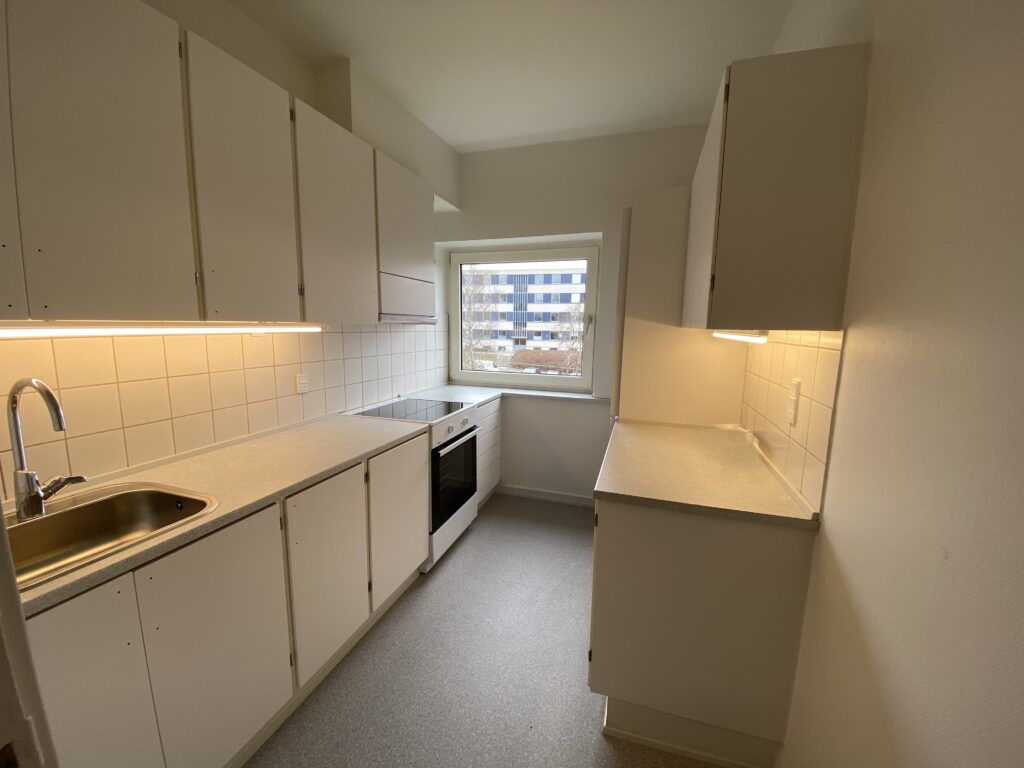 Køkkenet fremstår pænt og enkelt med god størrelse, fine arbejdsforhold samt god skabs- og bordplads. Et stort vinduesparti sikrer et dejligt lysindfald, som gør rummet lyst og indbydende.
