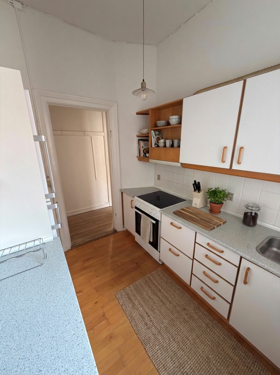 Køkkenet er separat og funktionelt indrettet med hvide elementer, trædetaljer og god bord- og skabsplads.