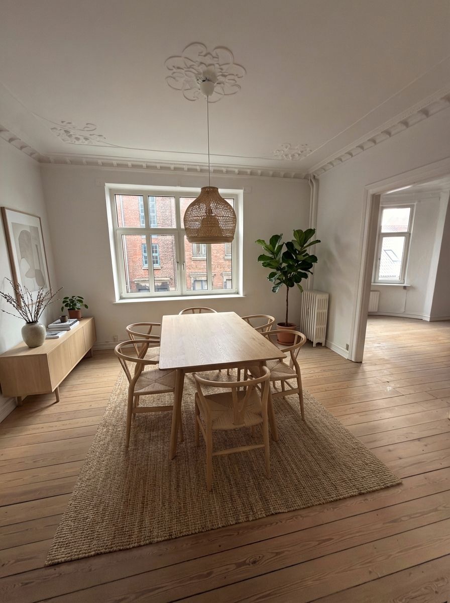 Her får du lyse, sammenhængende rum, højt til loftet med stuk og rosetter, smukke, lyse plankegulve samt store vinduer,