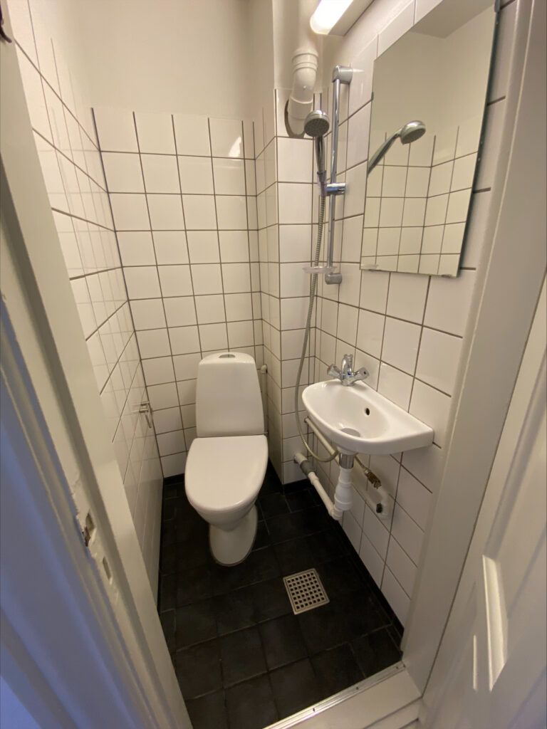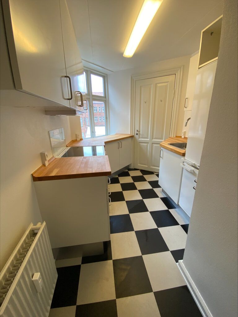 Lejligheden byder på et pænt og velholdt køkken med træbordplade, som giver en hyggelig landkøkken-stemning. Badeværelset er opdateret med flotte sorte klinker på gulvet samt nyere toilet og vask. Derudover er der en integreret bruseløsning, som gør rummet både funktionelt og stilrent.