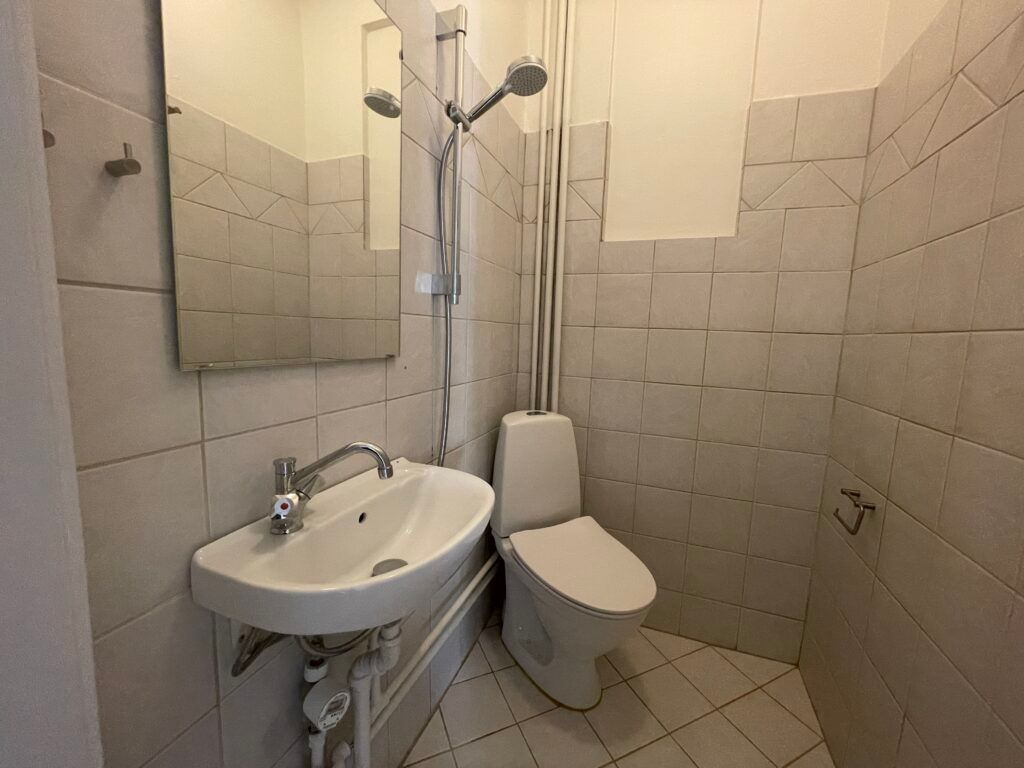 Badeværelset fremstår nydeligt med pæne fliser på både gulv og vægge samt integreret bruseløsning.
