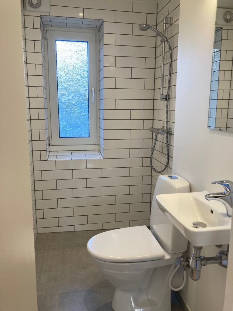 Badeværelset er moderniseret med grå klinker på gulvet og hvide fliser i brusenichen, hvilket giver et stilrent og funktionelt udtryk.