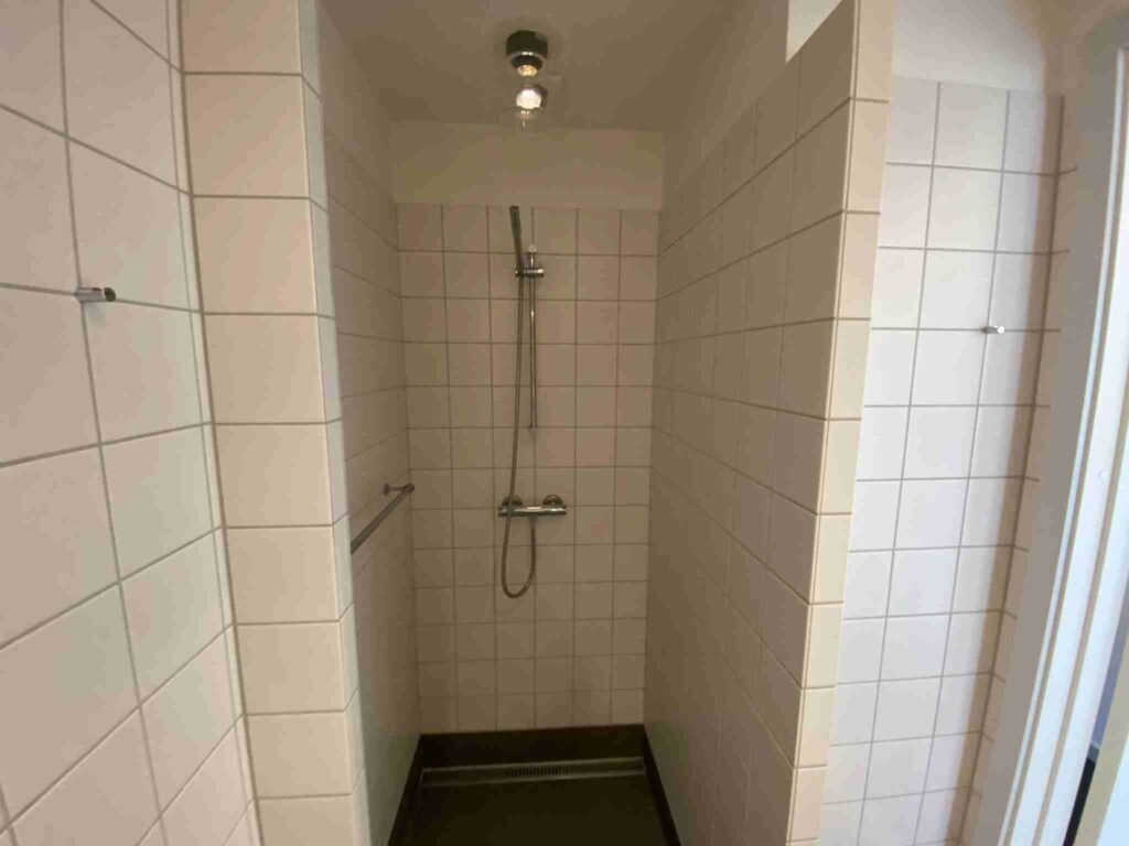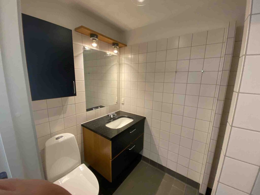 Badeværelset har en fin størrelse og er indrettet med bruseniche samt et flot badmiljø med god opbevaringsplads. Derudover er der et væghængt skab til yderligere opbevaring. Lejligheden har også en praktisk entré med indbygget skab til opbevaring af overtøj og sko.