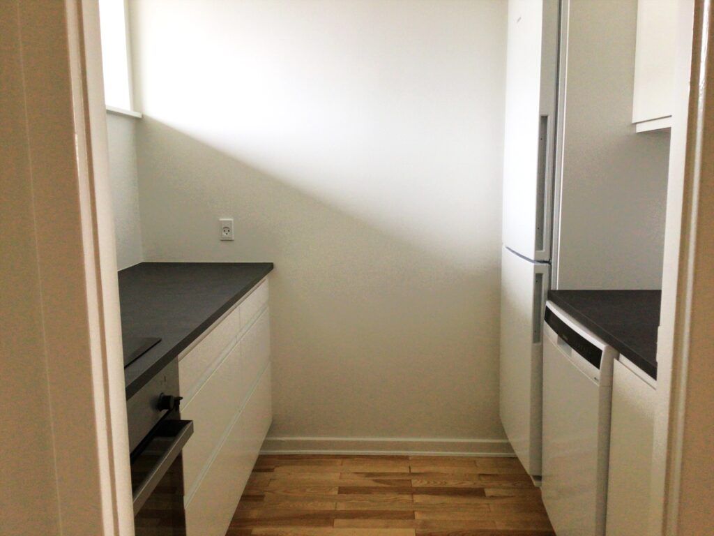 Lejligheden byder på et opdateret og moderne køkken med gode opbevaringsmuligheder samt opvaskemaskine, hvilket gør hverdagen både nem og bekvem.