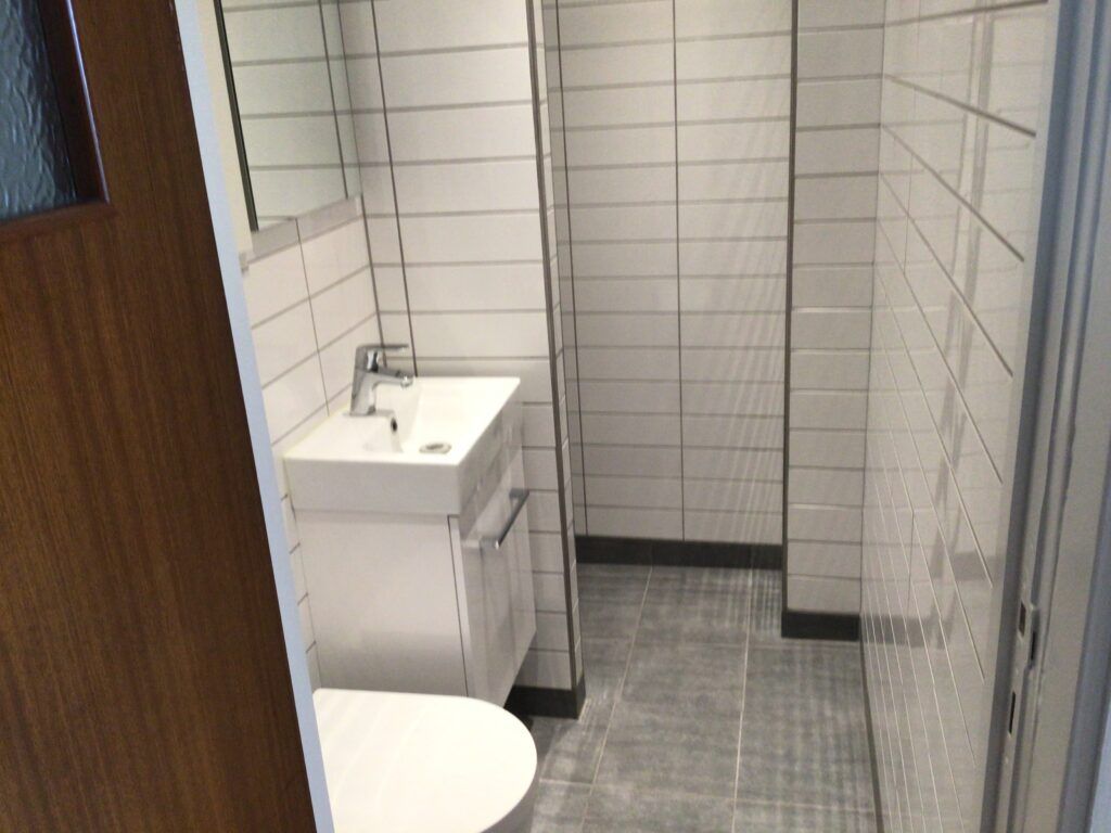 Badeværelset fremstår stilrent og moderne med et flot badmiljø med god opbevaringsplads. Her er separat bruseniche samt elegante fliser fra gulv til loft i tidssvarende design, kombineret med flotte grå klinker på gulvet. Badeværelset har desuden en fin og funktionel størrelse.