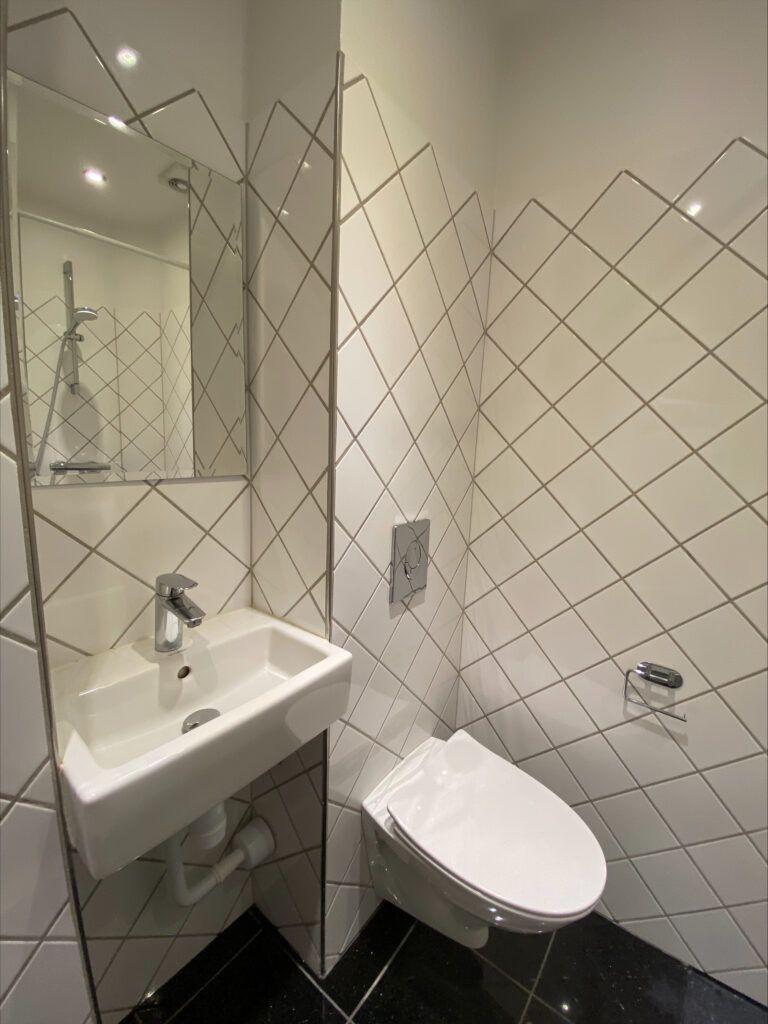 Badeværelset fremstår flot og moderne med bruseområde, væghængt toilet samt moderne fliser på både gulv og vægge. Loftet er udstyret med indbyggede spots, som giver et behageligt og stilrent lys.