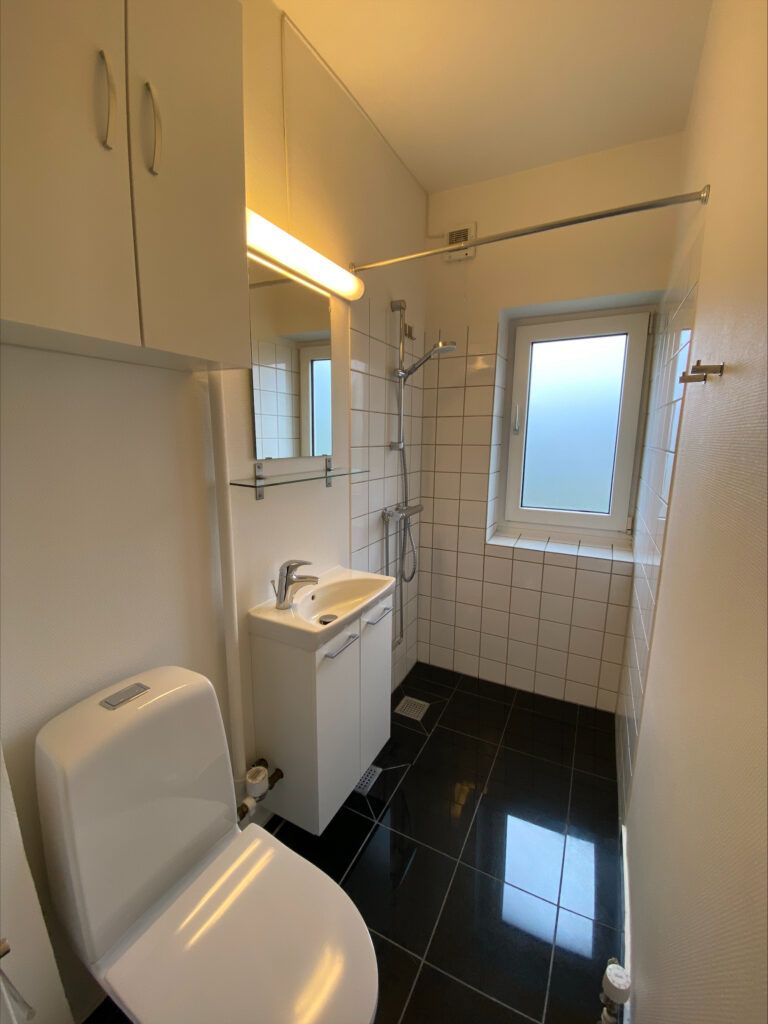 Lejligheden byder på et dejligt moderne køkken med flot træbordplade, god bord- og skabsplads samt opvaskemaskine. Køkkenet fremstår rummeligt og har et skønt lysindfald, der gør det til et behageligt opholdsrum. Badeværelset er flot opdateret med bruseniche, stilfuldt sort klinkegulv med gulvvarme samt praktiske opbevaringsløsninger i både væghængt skab og badmiljø.