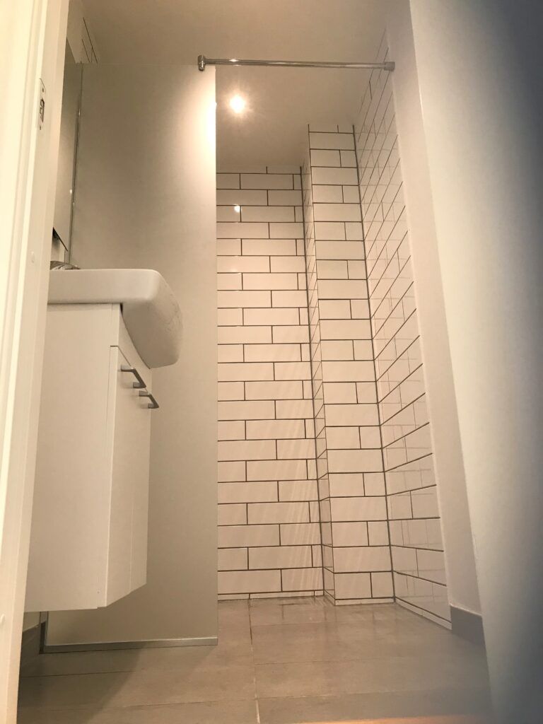 Lejligheden har separat toilet og badeværelse, som også er moderniseret. Badeværelset har bruseniche med moderigtige fliser fra gulv til loft samt opbevaringsmuligheder, mens toilettet har moderne grå fliser på gulvet og fremstår indbydende.