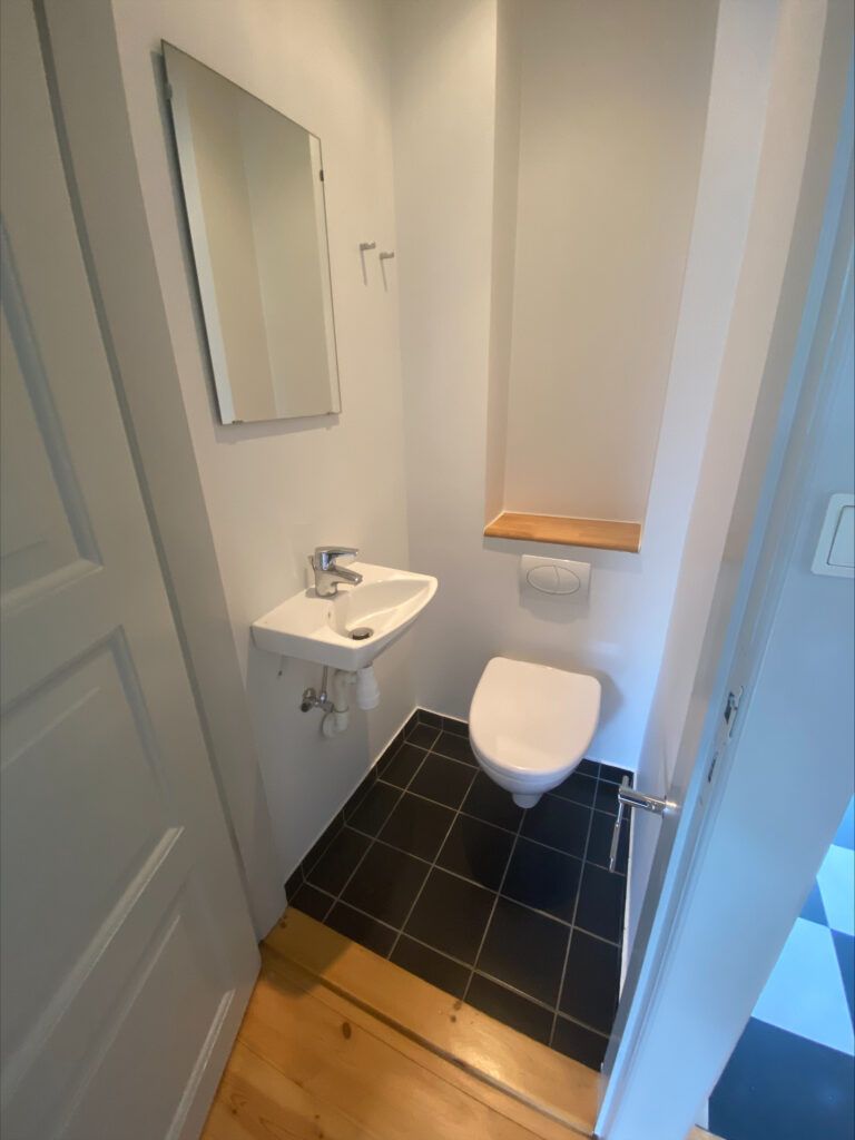 Lejligheden har separat bad og toilet. Toilettet er opdateret med væghængt toilet, moderne klinker på gulvet og nyere vask. Badeværelset er holdt i samme stil med samme moderne klinker på gulvet, har bruseniche og et større bademiljø med skabe under vasken samt vægskab. Begge rum har indbyggede spots i loftet, som giver et sammenhængende, flot og moderne udtryk.